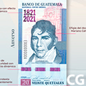 En los primeros días de septiembre, las autoridades del Banco de Guatemala, comenzaron a circular en su cede de la zona 1, los nuevos billetes de Q20, que tiene el mismo valor, solo cambia las imágenes, conmemorarativas del bicentenario de la independencia. También el Banco de Guatemala estarán vendiendo monedas de la denominación de un Quetzal, que tiene un valor de 420 quetzales, cada una, debido a que son de plata de 925 milésimas de plata y 75 milésimas de cobre. Los billetes de Q20 estarán circulando 20 millones, correspondiente a 500 millones de quetzales y serán 5 mil monedas de un quetzal, de plata que se estarán vendiendo. |